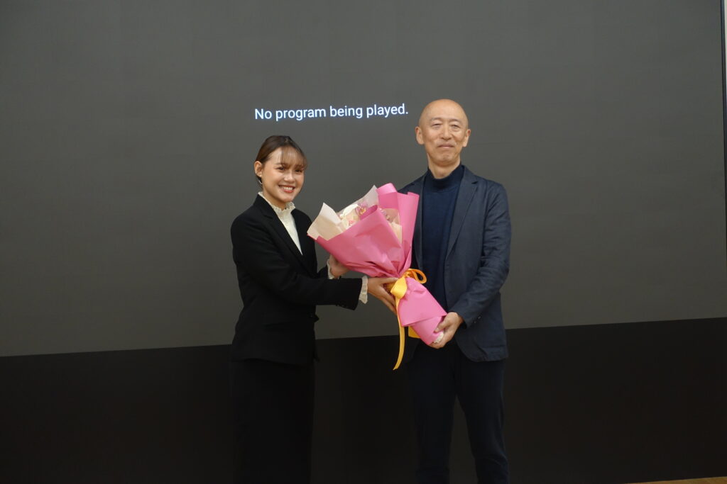 続いて、前マラウイ共和国 特命全権大使の大矢洋一様より「マラウイから見える日本の課題」と題し、日本における国際協力の仕組みと今後の展望、そしてアフリカ諸国の可能性など、外交官としての視点から貴重なお話をいただきました。講演の最後には、先日ご退官を迎えられた大矢前大使へ参加した留学生から花束が贈呈され、会場全体で長年のご功績に敬意を表しました。