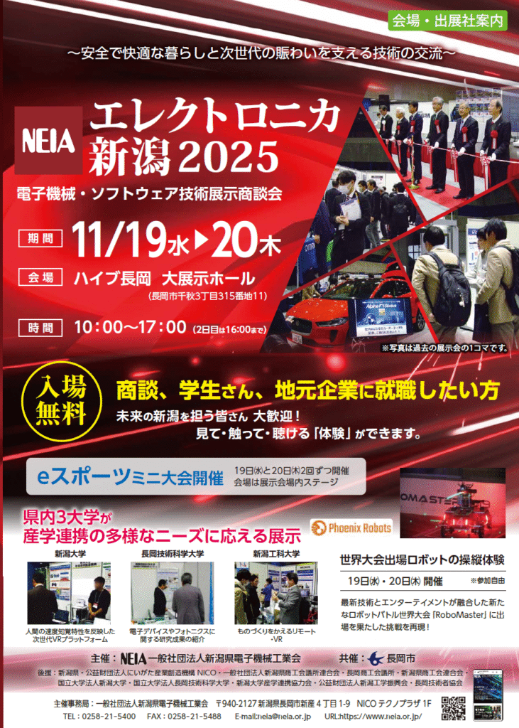 2025年11月19日(水)・20日(木)の2日間、ハイブ長岡にて「NEIAエレクトロニカ新潟2025(電子機械・ソフトウェア技術 展示商談会)」が開催されます。